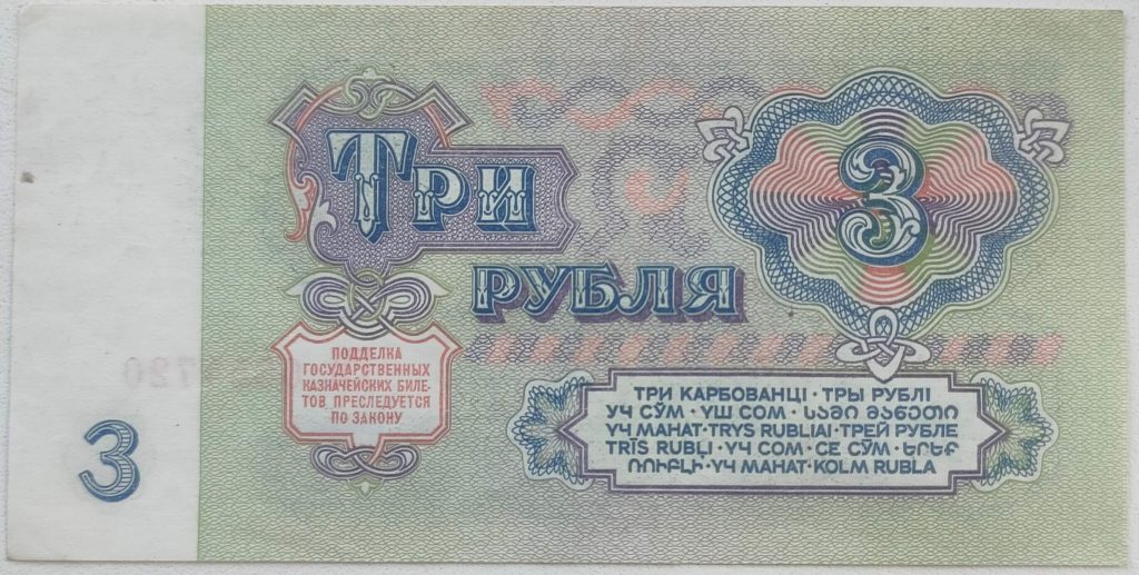 Оборотная сторона также насыщена деталями. В центре крупными буквами продублировано название номинала на русском языке, а вокруг располагаются надписи на языках всех союзных республик. Цифра «3» повторяется дважды: в розетке справа и на левом белом поле. В качестве защиты от подделок использовались водяные знаки в виде пятиконечных звезд.